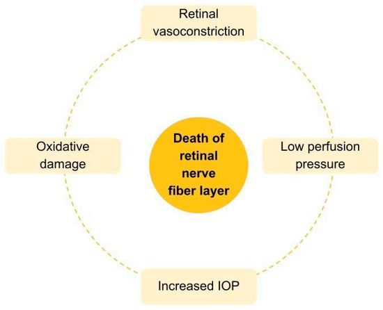 The mechanical theory hypothesizes that mechanical pressure on the optic disc and lamina cribrosa distorts the fovea and consequently compresses RGC axons, as well as blocks axoplasmic transport, resulting in the activation of apoptotic and necrotic pathways [7]. Nowadays, the only therapeutically addressable risk factor is elevated IOP, either medically or surgically [12]. Another pivotal theory is the ischemic one, of which crucial factors are illustrated in Figure 1 and detailed in the paragraphs below.