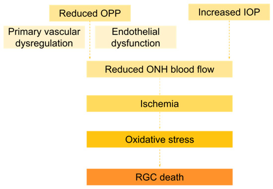 Vascular dysregulation involves the inability of a tissue to maintain a constant blood supply despite changes in perfusion pressure. Therefore, an insufficient blood supply to the optic nerve will induce ischemic and hypoxic processes in the RGCs and their axons, contributing to the development of glaucomatous pathology. Further, vascular abnormalities such as vasospasm syndrome and migraines were reported as risk factors for optic nerve damage in NTG [56].