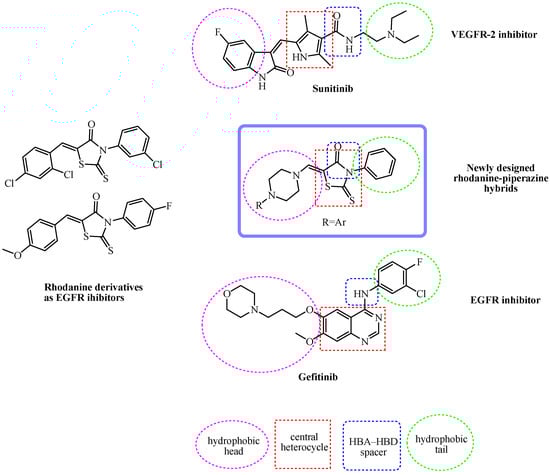 Based on the literature data regarding anticancer activity of rhodanine derivatives [] and the pharmacophore model for VEGFR/EGFR inhibitors described in the scientific literature [], new rhodanine–piperazine hybrids were designed as potential VEGFR/EGFR inhibitors (Figure 1).