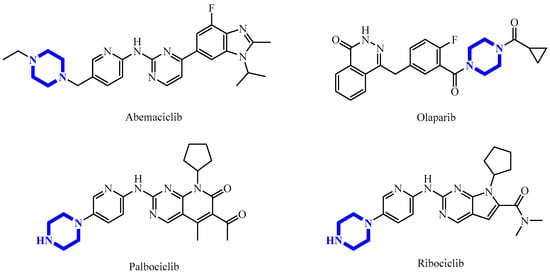 In addition, drugs officially approved by the US Food and Drug Administration agency containing the piperazine system (marked blue in Figure 2) and being used in the treatment of certain kinds of breast cancer are as follows: abemaciclib, olaparib, palbociclib, and ribociclib. All of these drugs are kinase inhibitors. For example, palbociclib was developed for the treatment of HR-positive and HER2-negative breast cancer []. It was the first cyclin-dependent kinases CDK4 and CDK6 inhibitor registered as a cancer therapy [].