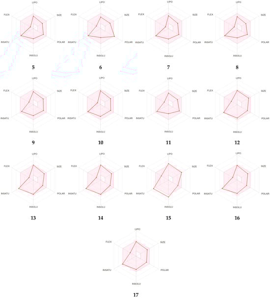 Bioavailability radar for rhodanine–piperazine hybrids (5–17). The pink area represents the optimal range for each of the properties (lipophilicity: XLOGP3 between −0.7 and +5.0, size: M between 150 and 500 g/mol, polarity: TPSA between 20 and 130 Å2, solubility: log S not higher than six, saturation: fraction of carbons in the sp3 hybridization not less than 0.25, and flexibility: no more than nine rotatable bonds).