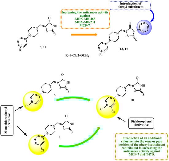 The structure–activity relationship of the tested rhodanine–piperazine hybrids against breast cancer cell lines.