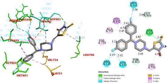 Compound 12 forms a hydrogen bond with Asp863 with a length of 2.44 Å. Additionally, the 4-fluorophenyl substituents of compound 12 engage in halogen non-covalent interactions with Met801, Arg849, and Asn850. It has to be mentioned that there is an interaction with Met801, which is significant for inhibition activity of the HER2 tyrosine kinase [,]. The two phenyl rings of 12 interact with Leu852, Ala751, and Val734 through π–σ and π–alkyl interactions. Furthermore, a weak carbon–hydrogen bond with Thr862 stabilizes the ligand’s position within the ATP binding cavity (Figure 5).