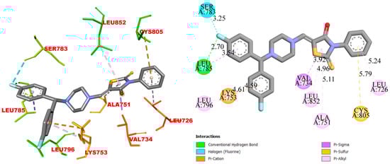 With the HER2 receptor, 15 establishes a hydrogen bond with Leu785 (at a distance of 2.70 Å) through the p-fluoro-phenyl core. Furthermore, this same fluorine atom engages in a halogen bond interaction with Ser783. The structural characteristics of the rhodanine ring, along with its phenyl substituent, are well-suited to fit within the channel formed by a cluster of lipophilic amino acids, including Val734, Ala751, Leu852, Cys805, and Leu726. Additionally, another p-fluorophenyl core establishes non-covalent Pi–alkyl and Pi–sulfur interactions with Leu796 and Lys753, respectively. Notably, there is no predicted interaction with Met801, which may significantly influence the inhibitory activity of 15, despite it having the best binding energy among all tested compounds (Figure 6).