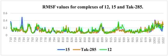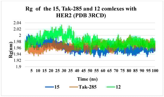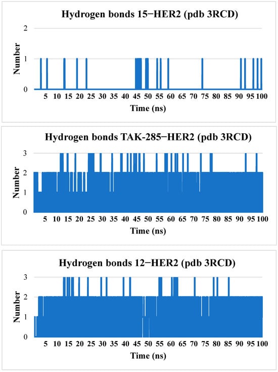 In silico simulations demonstrated comparable stability levels for the HER2–Tak-285, HER2–12, and HER2–15 complexes during the 100 ns simulations. Root mean square deviation (RMSD) analysis provides insight into the ligands’ fluctuations over time, enabling the measurement of local fluctuations, such as identifying residues with the highest mobility during the MD simulation (Figure 7). The RMSD values ranged from 0.10 to 0.22 nm, indicating no significant fluctuations. However, the HER2–Tak-285 complex exhibited less fluctuation within the ATP binding site compared to complexes with 12 and 15. This observation can be attributed to the smaller size of 12 and 15 compared to Tak-285 and the larger amount of hydrogen bonds.