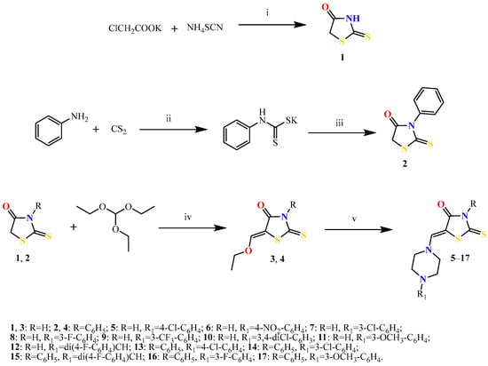 As a result of the reaction, 5-ethoxymethylidene-rhodanine (3) and 5-ethoxymethylidene-3-phenylrhodanine (4) were obtained. Compounds 3 and 4 were used for obtaining rhodanine–piperazine hybrids (5–17) by nucleophilic substitution of ethoxide with N-arylpiperazines. Scheme 1 illustrates the synthesis process.