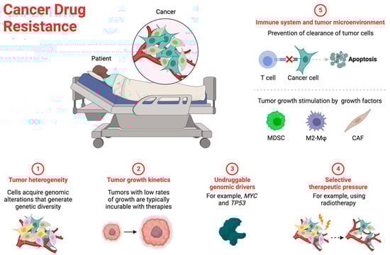 Five key factors have emerged as critical determinants of drug resistance: (1) tumor heterogeneity, which provides a reservoir of diverse cell populations capable of surviving therapeutic pressure; (2) tumor growth kinetics, particularly the persistence of slow-growing, drug-tolerant cells; (3) the presence of undruggable genomic drivers that maintain oncogenic signalling; (4) selective therapeutic pressure that drives the expansion of resistant clones; and (5) complex interactions between tumor cells, the immune system, and the microenvironment that collectively contribute to treatment resistance.