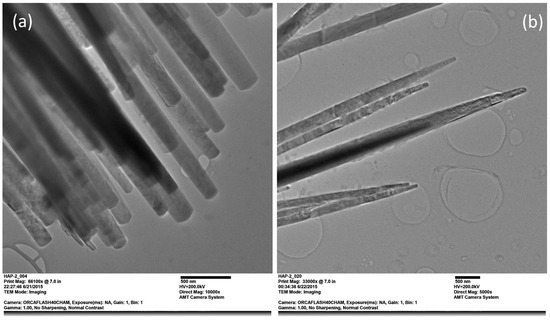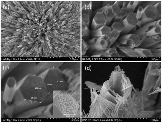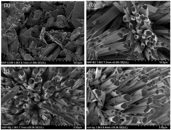 In the case of the magnesium-doped one, a morphology like that observed for pure HAp fibers was found. In Figure 1c,d, the well-defined ends of these fibers suggest consistent and reproducible growth throughout the synthesis process. According to Figure 1b–d, the addition of Mg2+ doping ions did not significantly modify the morphology of fibers.