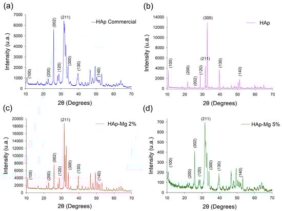 The synthesized HAp-Mg 2% and HAp-Mg 5% samples were subjected to analysis via X-ray diffraction by powders (XRD) to identify the crystalline phases present in the materials. These results were then compared with the corresponding diffractograms obtained for the commercial HAp sample and for the pure HAp nanofiber sample obtained using MAHM. The acquired diffractograms are depicted in Figure 3.