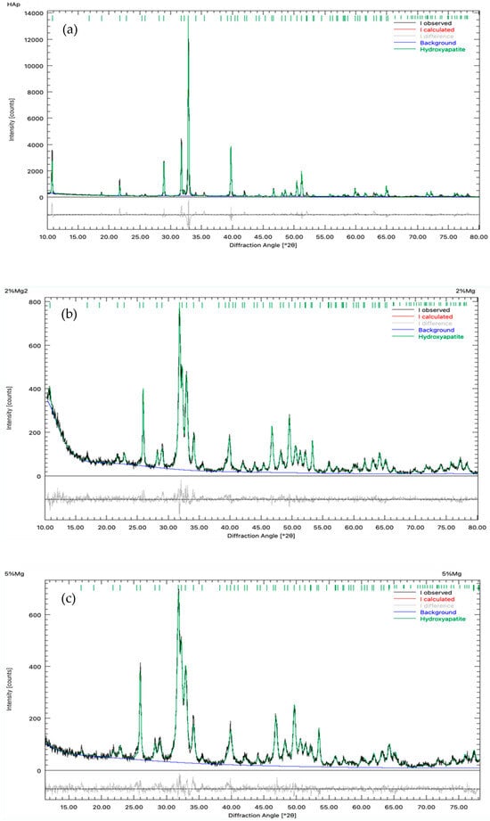 Rietveld refinement results revealed that a slight shortening occurred in the lattice parameters of the doped HAp, and this indicates that Mg2+ ions have been incorporated into the HAp crystal structure. Figure 4 shows the refinement carried out for the diffractograms of the pure HAp, HAp-Mg 2%, and HAp-Mg 5% samples. Table 1 displays the lattice parameter values obtained for all samples. Some Ca2+ ions (radius 114 pm) were replaced by Mg2+ ions (radius 86 pm), and the difference in ionic radius produced a consistent shortening in all lattice parameters of 0.13% when the HAp was doped with 2% wt. of Mg. Mg concentration increased up to 5% wt., but the lattice parameter varied differently. Parameters “a” and “b” were modified by 0.153%, and parameter “c” changed by 0.33%. Crystallite size decreased consistently with the increment of Mg concentration, and according to the diffractograms in Figure 3, crystallinity also reduced with the increase in doping concentration.