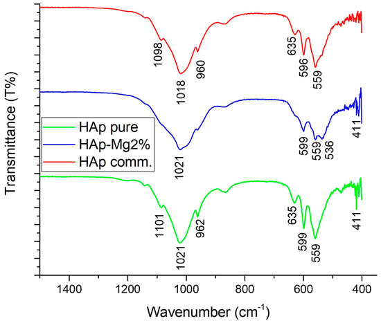 The band at 596 cm−1 present in the commercial HAp corresponds to bending vibrations of the phosphate bond (PO43−); in particular, it corresponds to the triply degenerate bending mode that is located between 575 and 610 cm−1 [17]. This band also underwent a shift to a higher wavenumber (599 cm−1) for the samples HAp-Mg 2% and HAp pure for the abovementioned reason.