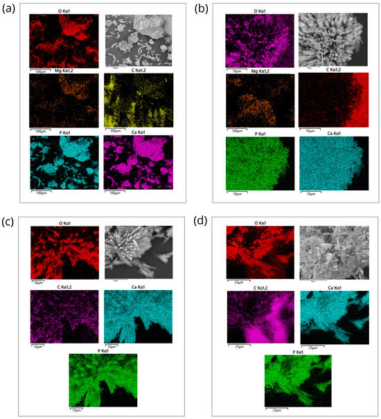 Energy-dispersive X-ray spectroscopy analysis of nanopowder samples of HAp. (a) Elemental mapping of HAp-Mg 2% nanofibers in a selected microscopic SEM area, scale bar of 100 µm; (b) elemental mapping of HAp-Mg 5% nanofibers in a selected microscopic SEM zone, scale bar of 100 µm; (c) elemental mapping of pure HAp synthesized by MAHM in a selected microscopic SEM area, scale bar of 100 µm; and (d) elemental mapping of commercial HAp in a selected microscopic SEM zone, scale bar of 100 µm.