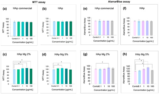 Impact of different hydroxyapatites on fibroblast viability. Results include (a–d) MTT assay and (e–h) AlamarBlue assay. Experiments were performed in triplicate; bar graphs show mean values ± SE. * ANOVA test with p < 0.05 for significance.