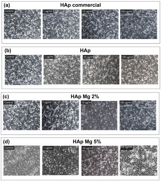 Cellular response of chicken embryo fibroblasts to hydroxyapatite-based treatments. Light microscopy images (10×) taken 24 h post-treatment with (a) commercial HAp, (b) pure HAp synthesized by MAHM, (c) HAp-Mg 2%, (d) HAp-Mg 5%, and the control group.