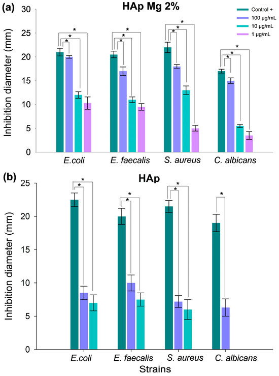 Evaluation of antimicrobial efficacy of nanohydroxyapatite samples against bacterial and fungal strains. Panels depict antimicrobial activity assays using the disk diffusion method with (a) HAp-Mg 2% and (b) pure HAp synthesized by MAHM. Graphs show average inhibition zone diameters from three independent experiments at different concentrations against bacterial and fungal strains. Results are presented as means with standard error bars. * ANOVA test was employed for inter-group comparisons with significance set at p < 0.05.