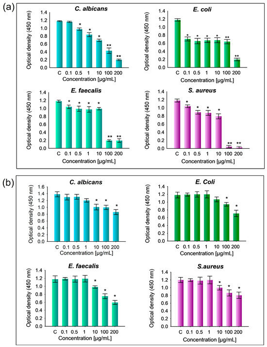 Overall, the results demonstrate that as the concentration of HAp-Mg 2% increases, there is a decrease in absorbance at 450 nm, indicating greater inhibition of microbial growth (Figure 12a). The strongest inhibitory effect on microbial growth is observed at a concentration of 200 µg/mL of HAp-Mg 2% across all analyzed strains. Additionally, significant differences are observed between the evaluated strains and the positive control (p < 0.05) (Figure 12a), suggesting the efficacy of HAp-Mg 2% as an antimicrobial agent against the test strains. In contrast, with pure HAp, a lesser inhibition effect on microbial growth is noted compared to HAp-Mg 2%, becoming evident at concentrations as low as 10 µg/mL without achieving complete inhibition of bacterial or fungal growth even at the highest concentration tested (Figure 12b). Significant differences in the optical density of microbial cultures treated with pure HAp compared to the untreated control are observed from a concentration of 10 µg/mL onwards (p < 0.05) (Figure 12b).