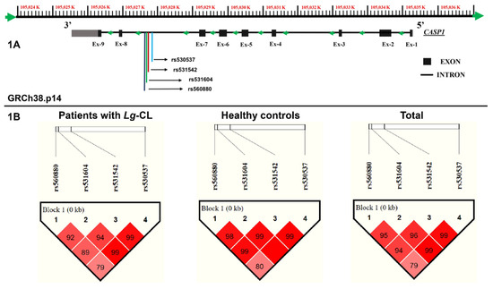 This case–control study compared unrelated Lg-CL patients to unrelated healthy individuals, following the Strengthening the Reporting of Genetic Association Studies (STREGA) guidelines. The CASP1 gene is located on chromosome 11q22.3 and comprises nine exons, as shown in Figure 1A. The variants rs530537A>G, rs531542C>T, rs531604A>T and rs560880G>T are located in intron 8. The genotype frequencies of the CASP1 variants (rs530537A>G; rs531542C>T; rs531604A>T; rs560880G>T) are presented in Table 1. All four variants studied conformed to the Hardy–Weinberg equilibrium expectation. Based on the success rates of direct nucleotide sequencing, 780, 745, 745 and 725 Lg-CL patients had high-quality genotypic data for the variants rs530537, rs531542, rs531604 and rs560880, respectively. For the HC group, the corresponding success rates were 760, 770, 765 and 752, respectively. The genotype distribution for the four variants did not significantly differ between Lg-CL patients and HCs.