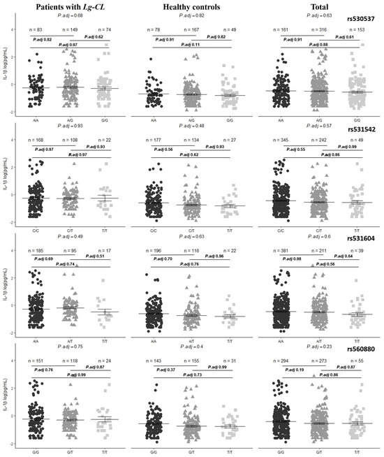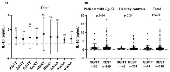 The statistical comparison of the genotypes between patients with Lg-CL and HCs was performed using logistic regression analysis, calculating the odd ratio (OR) and 95% confidence interval (CI), with adjustments for sex and age, using the R software version 4.3.1 of the SNPassoc package 2.1-0, which also supports different inheritance models (codominant, dominant, recessive and overdominant). Allele frequencies were calculated using the gene counting method, and the Hardy–Weinberg equilibrium was assessed by comparing the observed and expected genotype frequencies. Linkage disequilibrium analysis, haplotype construction and comparisons were conducted using the Haploview software 4.2. The plasma IL-1β levels by genotype were analyzed using a Generalized Linear Model (GLM) for quantitative traits in the R software with the SNPassoc package and visualized using the ggplot2 package. Post hoc analysis following ANOVA was conducted using the postHoc package version 0.1.3 in the R software (www.r-project.org) to compare the effect levels based on the genotypes, and the p-values were corrected using the false discovery rate (FDR).