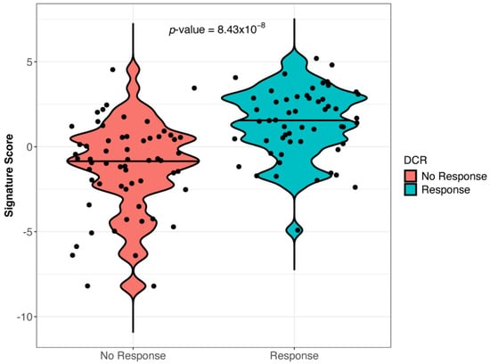 The analysis of blood samples collected at baseline showed that a gene expression signature was associated (the cut-off point was 1.76 at the 26th percentile) with response to anti-PD-1 and cetirizine treatment. It included 15 genes (TRAF1, S100A9, S100A8, S100A12, OLR1, NF1, MMP9, LDHA, ITGAM, ICOSLG, HLA-DPA1, FSTL3, CST2, CLEC5A, and ANLN). Only the increased expression of inducible T cell costimulator ligand (ICOSLG) with a loading value > 0.3 directly correlated with a higher probability of response to treatment (Supplementary Figure S1A). The other genes of the signature were negatively correlated with the probability of response. The accuracy of the association between signature expression and the DCR is shown in Supplementary Figure S1B. The expression of the signature was significantly more frequent in responders than in non-responders (p < 0.01) (Figure 1).