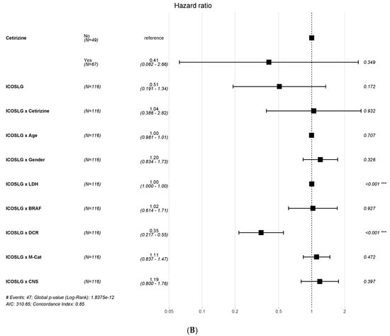 Circulating biomarkers and tumor molecular signatures have been previously investigated in advanced melanoma to identify patients with resistance hallmarks and a reduced probability of response to checkpoint inhibition. A tumor inflammation signature including 16 genes was associated with response to anti-PD-1 []; tumor mutational burden and microsatellite instability are considered predictive tissue markers of metastasis, based on results from KEYNOTE-158 [,,]. Our transcriptomic analysis showed a gene expression signature associated with response to anti-PD-1 treatment in this patient population. The signature included 15 genes, but only ICOSLG was directly correlated to the DCR when detected with a loading value > 0.3 (Supplementary Figure S1). ICOSLG has a relevant role in immune antibody response modulation [] and was a suitable candidate as a possible predictive biomarker for response to treatment. Therefore, we decided to select it for further analysis. The clinical relevance of ICOSLG expression was evaluated by comparing PFS and OS Kaplan–Meier curves of patients with high versus low gene expression; the findings showed that only when the ICOSLG expression is high, patients receiving cetirizine have better outcomes than those not receiving it. This result was confirmed by a multivariable model of logistic regression showing a positive association of the DCR with ICOSLG expression for PFS and OS in patients receiving cetirizine and anti-PD-1 versus those receiving only anti-PD-1. The advantage of receiving cetirizine in those with ICOSLG expression was present even though the cetirizine subgroup had a higher frequency of negative predictive factors such as BRAF mutation, an elevated LDH level, and CNS metastases. On the contrary, the association of ICOSLG with LDH had no association with survival.