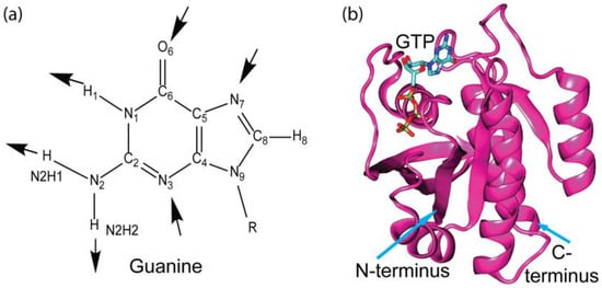 (a) The guanine base of the guanine nucleotide (GTP/GDP/GMP), where the symbol R represents ribose and phosphate groups. The inward arrow shows the hydrogen bond acceptor, and the outward arrow shows the hydrogen bond donor. All the atoms are labeled according to the IUPAC naming system. (b) Structure of a representative GTP-binding protein: a p21-ras protein bound to GTP (PDB ID:1QRA).