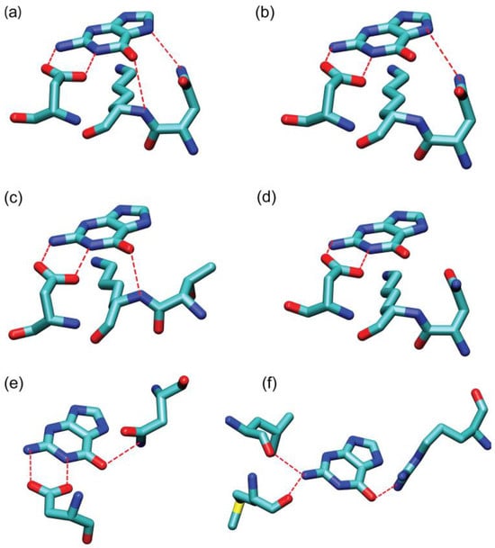 Based on the three-dimensional structures, the binding pockets of the guanine bases within their respective target GTP-binding proteins were meticulously analyzed using the Visual Molecular Dynamics (VMD) program to identify residues that engage in non-bonded interactions with each guanine base. Consistent with the physical nature of each type of non-bonded interaction, a cut-off distance of 3.5 Å between the donor and the acceptor was used for hydrogen bonding, and a cut-off distance of 5.6 Å was used for π–π stacking and cation–π interactions. For the former interaction, a slightly longer distance of 3.5 Å, rather than the optimal hydrogen bonding range of 2.8 to 3.2 Å, was adopted to account for the dynamic fluctuations in atomic positions. For the latter interactions, the computed strengths of the solution-phase interaction energies typically diminished beyond 5.6 Å, as indicated by our prior quantum chemical calculations []. The non-bonded interactions (hydrogen bonding, π–π stacking, and cation–π interactions) so identified were carefully studied, with details tabulated in Table S1 of the Supplementary Materials. Those non-bonded interactions are described and analyzed below.