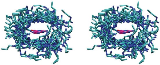 Cation–π interactions were systematically examined across all 298 GTP-binding proteins, revealing this interaction as a prevalent non-bonded interaction mode for GTP binding in proteins. In 86.6% of GTP-binding proteins (258 out of 298), at least one cation–π interaction does exist between the guanine base and positively charged side chains of the interacting residues. Furthermore, about 48% of the complexes have more than one positively charged residue interacting with guanine. These complexes are aligned by the superimposition of the guanine base, and Figure 3 shows a 3D stereo drawing of the aligned GTP-protein complexes featuring one or more positively charged residues (lysine and arginine) within 5.6 Å of the guanine base.