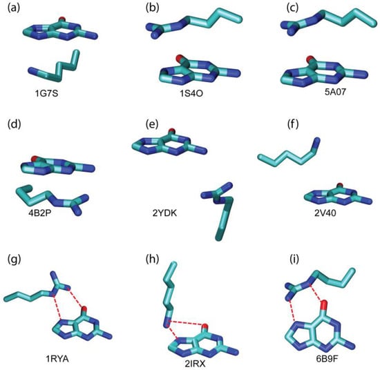 Representative cation–π interactions between the positively charged residues and the guanine ring. PDB IDs for the cation–π interacting motifs are displayed. C, N, and O atoms are colored in cyan, blue, and red, respectively. The red dashed line indicates the coexistence of hydrogen bond interactions.