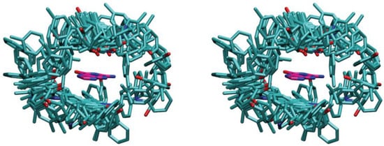 A 3D stereographic drawing of a guanine base surrounded by aromatic residues. All of the 162 complexes that contain π–π stacking interactions are aligned by the superimposition of the guanine base.
