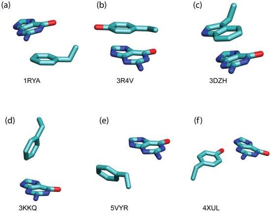 To quantitatively assess the contribution of π–π stacking interactions to the binding of guanine with their target proteins, we employed quantum chemical calculations to evaluate the strength of these interactions between the guanine base and its interacting residues. We selected 14 distinct intermolecular pairs (comprising guanine and aromatic residues) based on the patterns shown in Figure 5. These pairs were chosen according to two criteria: representativeness and uniqueness. A representative pair samples the most prevalent regions in Figure 5, while a unique pair is specifically positioned and oriented within that figure. The three-dimensional structures of 6 of these 14 π–π stacking interacting pairs are illustrated in Figure 6.