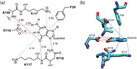 It is now widely accepted that molecular recognition is mediated through non-covalent interactions (also known as non-bonded interactions) such as hydrogen bonding, metal coordination, van der Waals forces (VDW), cation–π interaction, π–π stacking interaction, CH–π interaction, XH–π interaction (X = N, O, S), salt bridge, etc. [,,,,,]. To understand the molecular recognition of guanine, one needs to know the specific non-bonded interactions between guanine and its surrounding residues in proteins.