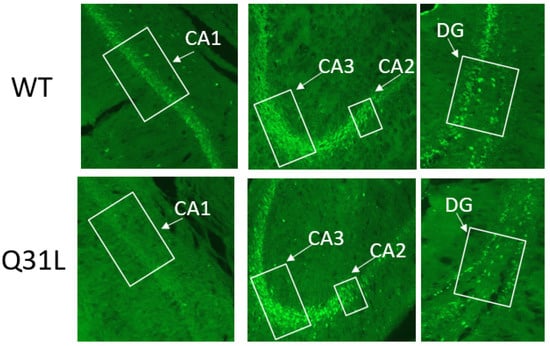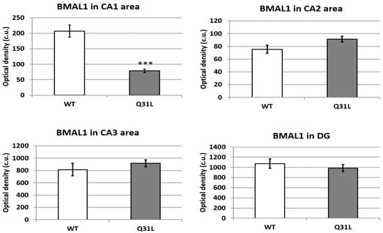 2.6. Q31L Mutation Decreased BMAL1 Immunofluorescence in Key Brain Regions Involved in Affective Disorders and Stress Response