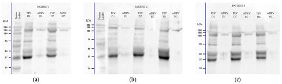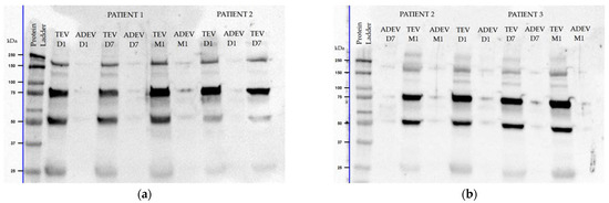 Representative Western blots for glial cell line-derived neurotrophic factor (GDNF) of three AIS patients with three key moments (a,b). Data for patient 2 is presented on separate blots: D1 and D7 TEV (a), D7 ADEV and M1 (b). The blots display multiple bands in EV aliquots: at ≈25 kDa as a monomer, at ≈50 kDa as a dimer, and, additionally, near 75 and 150 kDa MW as a combination of a monomer and dimer. Approximate MW markers in kDa are labeled adjacent on the left.
