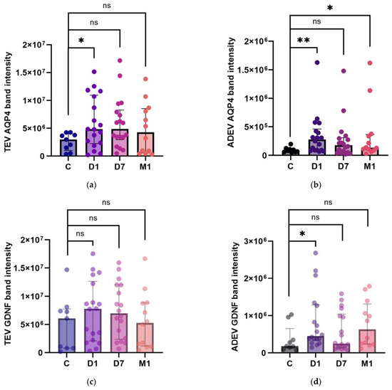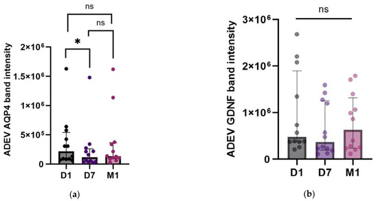 AQP4 (a) and GDNF (b) band intensities in ADEVs during the patients’ follow-up: D1, D7, and M1. Data are represented as individual value boxplots with median and IQR (Friedman’s ANOVA, followed by Dunn’s post hoc only for AQP4 (a), as for GDNF, there were no statistically significant differences (b); * p < 0.05; ns—not significant).
