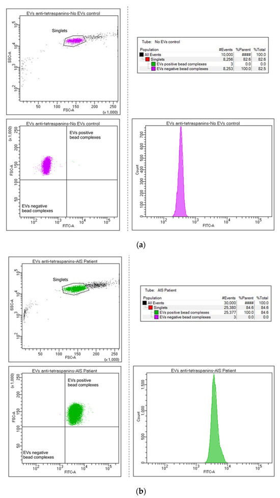 Bead flow separation data for the anti-tetraspanin antibodies coupled with Exo-FITC staining showing beads with no captured EVs (a) and beads with captured EVs = tetraspanin-positive (CD9, CD63, and CD81) EVs population (b).