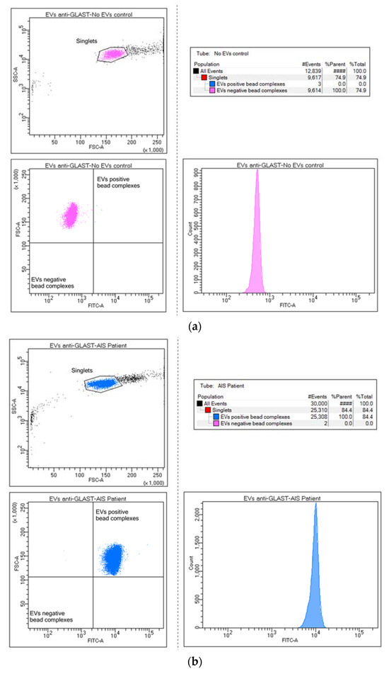 Bead flow separation data for the anti-GLAST antibody coupled with Exo-FITC staining showing beads with no captured EVs (a) and beads with captured EVs = GLAST-positive EVs population (b).