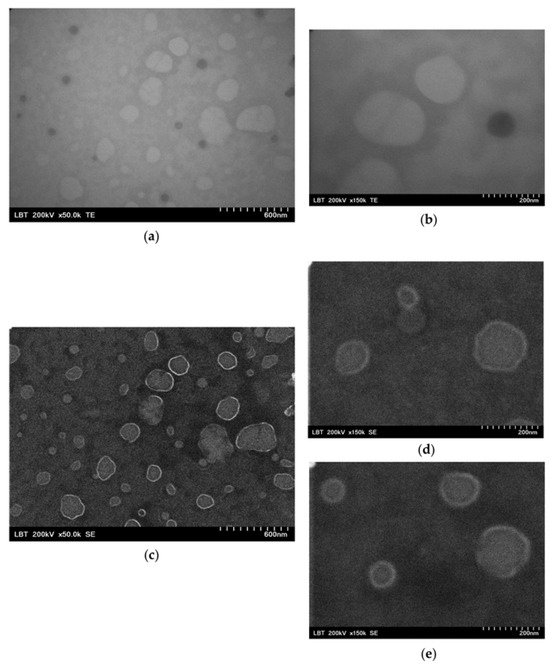 Transmission (TE, (a,b)) and scanning electron micrographs (SE, (c–e)) of the isolated EVs shown at two different magnifications of 50,000× (a,c) and 150,000× (b,d,e). Multiple vesicles with typical EV morphology can be seen in each image.