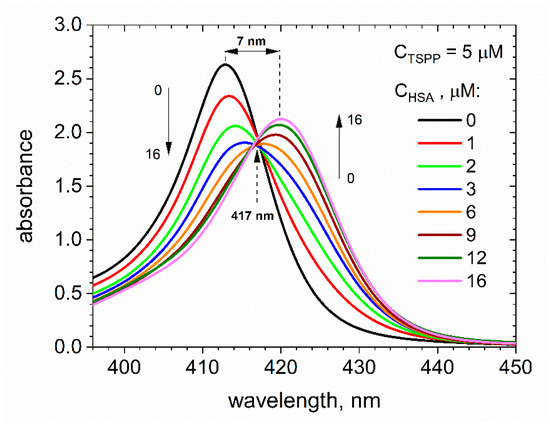 Figure 1 shows the absorption spectra of buffer solutions (pH ca. 7) containing porphyrin with a constant concentration of CTSPP = 5 μM and albumin with concentration CHSA increasing from 0 to 16 μM. The spectra do not indicate the presence of protonated monomeric or J-aggregated forms of porphyrin, which is consistent with the other reports for neutral porphyrin and porphyrin–HSA solutions [20,24,25]. In the absence of protein, the absorption spectrum of TSPP shows a typical behavior for a monomer with the Soret band, which corresponds to the S0→S2 transition and has a single peak with a maximum at 412 nm. Upon complexation with albumin, a reduction in the intensity and a redshift of the band are observed. As the HSA concentration increases, a new band with a maximum at 420 nm develops, and this band corresponds to the porphyrin bound to the protein. Around 417 nm, we search for an isosbestic point, but it is not well defined. On the one hand, this indicates the coexistence of the free and HSA-complexed forms of porphyrin in the solution; on the other hand, it suggests that porphyrin can bind to HSA at various sites and the resulting complexes may not have a strict 1:1 stoichiometry [25].