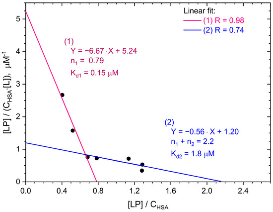 The intersection points of the Scatchard graph with the coordinate axes in the case of two independent types of binding sites can be easily found using the linear fits (1) and (2) shown in Figure 3. Fit (1) refers to experimental points in the range of low albumin occupancy rate, whereas fit (2) refers to points with high [LP]/CHSA values. The intersection of the Scatchard graph with the vertical axis is at the point with the ordinate n1/Kd1 + n2/Kd2 (Equation (15)) and with the horizontal axis at the point with the abscissa n1 + n2 (Equation (17)). Since Kd1 << Kd2, the following can be assumed in the first approximation: