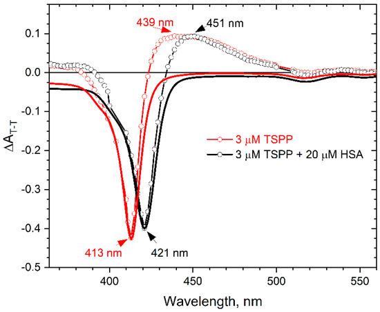We performed laser flash photolysis measurements for the TSPP solutions with and without HSA, and we recorded the triplet–triplet absorption spectra of TSPP, which are shown in Figure 4. As can be seen, the presence of protein clearly changes the T–T absorption spectrum of the porphyrin. The maximum of the T–T absorption for the buffer solution of TSPP is observed at 439 nm, whereas it is observed at 451nm for the TSPP–HSA solution. TSPP transient absorption spectrum has a strong bleaching peak at 413 nm for the buffer solution and at 421 nm for the solution with HSA. The bleached spectra perfectly match the respective absorption spectra of the TSPP and TSPP–HSA solutions, which have been further plotted in Figure 4 (continuous red and black lines) after simple modifications (the absorbance values were multiplied by −1 and then each of the spectra was normalized to the minimum of the corresponding transient absorption spectrum).