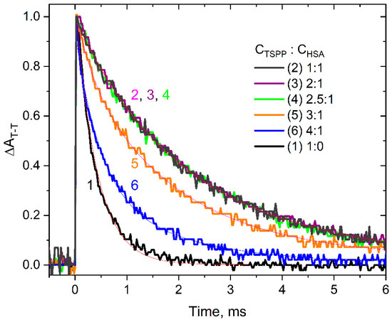 Kinetic curves of triplet–triplet absorbance decay recorded at λ = 460 nm for buffer solutions containing TSPP and HSA in the following molar ratios: 1:0 (10:0 µM; curve 1), 1:1 (30:30 µM; curve 2), 2:1 (40:20 µM; curve 3), 2.5:1 (50:20 µM; curve 4), 3:1 (30:10 µM; curve 5), and 4:1 (40:10 µM; curve 6). Kinetic curves were recorded after a pulse of laser light with a wavelength of λ = 351 nm. The solutions were vacuum deaerated. The kinetic curves were registered for 460 nm. Exponential functions of the best fit are superimposed on the experimental curves. Exponential best-fit functions are superimposed on the experimental curves (parameters of the fits are provided in the Supplementary Materials Table S1).