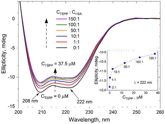 Far UV CD spectra of buffer solution of HSA (0.25 μM) and TSPP; the porphyrin to protein molar ratio, CTSPP/CHSA, changes from 0:1 to 150:1, room temperature. Inset: ellipticity measured at λ = 222 nm as a function of the porphyrin concentration in the buffer solution of HSA (0.25 μM).