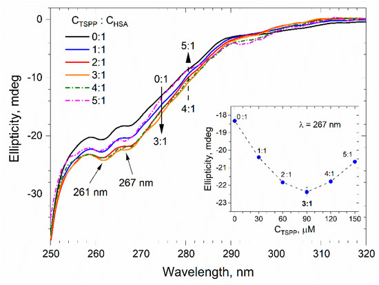 The CD signal in the near UV range is much weaker than the signal in the far UV range. Therefore, to record the CD spectra in near UV, we prepared solutions with a higher HSA concentration than before. The near UV CD spectra of buffer solutions containing albumin with a concentration of CHSA = 30 µM and porphyrin with a concentration increasing from 0 to 150 µM are presented in Figure 8. The addition of TSPP results in changes in the CD spectrum of albumin. The changes are more pronounced in the spectral region of phenylalanine (255–270 nm) and tyrosine residues (275–282 nm) than in the region of tryptophan residue (285–305 nm) [40]. All these spectra have two minima, at 261 and 267 nm. To determine how strong the influence of the presence of porphyrin has on the tertiary structure of the protein, we made a graph of the dependence of ellipticity recorded at a wavelength of 267 nm on the concentration of TSPP. This graph shows the inset in Figure 8.
