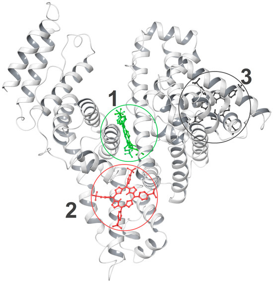 Overall view of the HSA native structure with three TSPP docking sites found, each marked with a circle: green for site 1, red for site 2, and black for site 3.