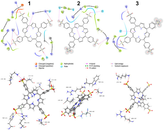 MD simulations were performed with the application of the Desmond v5.3 software (Schrödinger). The Desmond Interaction Diagrams, which are the result of the analysis of data recorded in the MD simulation trajectory, provided information on the stability of the considered porphyrin–protein complexes under conditions resembling a buffer solution [44]. For a given complex, the first frame of the trajectory corresponded to time t = 0 and was treated as the reference frame. The program used the Root Mean Square Deviation RMSD(t) function to monitor the average change in the displacement of a selection of atoms for successive frames, i.e., at times t > 0, with respect to the reference frame. All protein frames were first aligned on the reference frame backbone, and then the function RMSD(t) was calculated based on the atom selection. In the case of albumin, the selected atoms were the Cα atoms of the amino acid residues. The albumin RMSD functions calculated for all considered systems - did not indicate the occurrence of significant conformational changes and proved that each simulation converged (RMSD values stabilized around a certain mean value). The mean RMSD values for albumin 1E78 in the simulations were in the range of 2.3–2.7 Å for complexes 1–3 and in the range of 3.1–3.3 Å for albumin 1O9X. The selected atoms for the calculation of the porphyrin RMSD(t) function were all heavy atoms of TSPP. This function characterizes the stability of porphyrin with respect to albumin and its binding site. The mean RMSD values for porphyrin were in the range of 1.8–5.5 Å. The highest values corresponded to complex 2 in both albumin structures, and this may be related to a temporary loss of stability of the complex (probably as a result of a slight change in conformation, or a slight shift of porphyrin from its initial position).