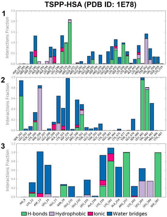 The populations of contacts (interactions) between amino acid residues of albumin (PDB ID: 1E78) and TSPP obtained for the three binding sites during the Desmond MD simulation. The three binding sites correspond to those depicted in Figure 9. Contacts are classified into four types (hydrogen bonds, hydrophobic, ionic, and water bridges) and each interaction type is assigned a color according to the legend.