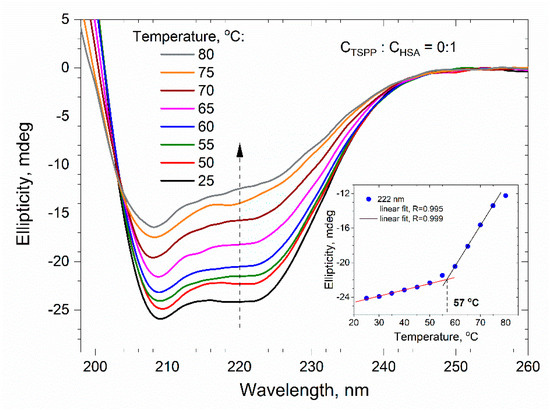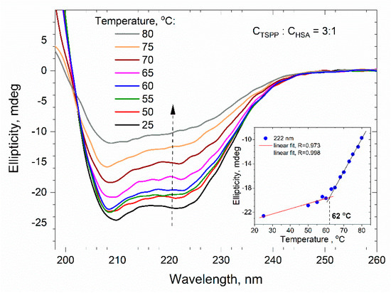 The inset of Figure 6 presents the dependence of the CD signal, registered at 222 nm wavelength for buffer solutions of HSA (0.25 µM) and TSPP, on the porphyrin concentration. For a molar ratio of porphyrin to albumin lower than 10:1, the ellipticity θ decreases very fast with an increase in CTSPP. A further increase in porphyrin concentration results in a much slower decrease in ellipticity. The arrangement of points on the graph therefore suggests a change in the mechanism of interaction of porphyrin molecules with the secondary structure of the protein.