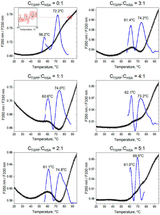 The first line corresponds to low TSPP concentrations and represents one of the mechanisms of interaction of porphyrin molecules with albumin structure. This mechanism can consist of binding a few consecutive TSPP ligands inside albumin. For intermediate concentrations (the second regression line), other mechanisms or factors become increasingly important, e.g., the electrostatic interaction of ionic porphyrin with the protein surface or the ionic strength of the solution which increases together with CTSPP. These factors are dominant in the range of high porphyrin concentrations [34,35]. As the CTSPP/CHSA ratio increases beyond 12.5 (indicated as the third regression line in Figure 7 and visible in the inset in Figure 6—points above the CTSPP:CHSA ratio of 10:1), excess TSPP molecules begin to aggregate independently on the surface of the albumin. In this phase, the interactions between porphyrin molecules become more dominant than the interactions between individual TSPP molecules and HSA. The transition from low to intermediate porphyrin concentration may be associated with a change in the nature of TSPP–HSA interactions. The CTSPP value, which determines this transition, was estimated via the intersection of the first and the second regression lines. This value corresponds to the molar ratio CTSPP/CHSA = 3:1.