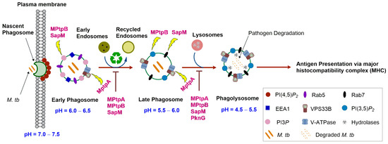 A number of sophisticated mechanisms directed towards degrading and eliminating the pathogen take place in phagolysosomes. Indeed, the phagosome–lysosome fusion results in membrane remodelling (alterations in the characteristics of the phagosomal membrane) and the acquisition of more V-ATPases, in addition to lysosomal hydrolases (proteolytic enzymes), such as proteases, cathepsins, lipases, and lysosomes [10,14]. The low luminal pH of the phagolysosomes can be directly toxic to the microorganism, in addition to being optimal for the hydrolytic enzymes to carry out the degradation process of the phagocytosed pathogen [9,10]. Furthermore, other microbicidal elements come into the picture, including scavenger molecules and reactive oxygen species. Collectively, the oxidative and degradative milieus of the phagolysosomes render the interior environment inhospitable to the invading microorganisms, which ultimately leads to pathogen degradation [10]. The protein-based microbial antigens resulting from this process are then presented to the T-lymphocytes, whereupon the adaptive immune system gets activated [9]. Therefore, the adequate maturation of phagosomes into phagolysosomes (innate immunity) is of paramount importance for the degradation of the pathogen and presenting the degraded antigen to the adaptive immunity, which will subsequently result in eliminating the pathogen. In general, this phagocytic process is efficient in removing the invading microorganisms and maintaining homeostasis. However, several microbes, including M. tb, have developed tactics to prevent phagosomal ripening and thwart the phagosome–lysosome fusion [10]. Accordingly, these microbes survive in the host by escaping the macrophage killing schemes, perpetuating the infection.