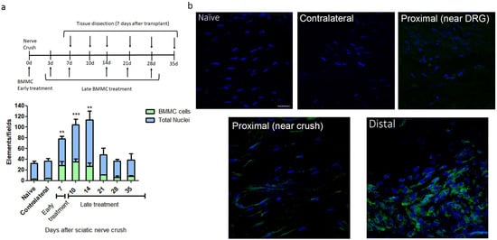 Kinetics of BMMC migration (n = 5, 60×, scale bar: 10 µm). (a) Experimental design indicating EGFPBMMC transplant and tissue collection times. For all time-points, animals were sacrificed 7 days post-transplant: Bar graph showing total nuclei (blue) and EGFPBMMC (green) per field in naïve and distal areas of IL nerves at different days post injury. Values are expressed as mean ± SD. Statistical analysis performed through one way-ANOVA followed by Dunnett’s post-hoc test. ** p < 0.01, *** p < 0.001 (EGFPBMMC on different days post injury vs. naïve). (b) Representative confocal microscopy images of a naïve, contralateral, proximal near DRG, proximal near crush and distal area of an ipsilateral nerve 14 days post injury showing DAPI-positive nuclei (blue) and transplanted EGFPBMMC (green).